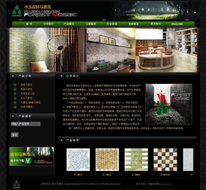 产品主要包括:1、常规马赛克;2、马赛克复合板;3、异形马赛克;4、玻璃马赛克;5、桌面马赛克;6、玉石复合玻璃;7、花岗岩复合板等几大系列,广泛应用于酒店、高档休闲场所及家庭装潢,把现代科技与古典艺术完美结合,使其更加光彩夺目。 优秀品质、准确交货期、合理价格一直是我们遵承的经营理念。并以专业的精神和专注的态度服务于市场及广大客户。产品已行销欧美、日本、东南亚等多个国家及地区,得到广大客商的认可和好评。