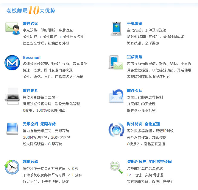 企业邮箱是指以您的域名作为后缀的电子邮件地址。通常一个企业经常有多个员工要使用电子邮件,企业电子邮局可以让邮局管理员任意开设不同名字的邮箱,并根据不同的需求设定邮箱的空间,而且可以随时关闭或者删除这些邮箱。通常一个企业有多个员工要使用电子邮件,集团邮局系统可以让您企业的邮局管理员任意开设不同名字的邮箱,并根据不同的需求设定邮箱的空间、邮箱的类别和所属的群体,而且可以随时关闭或者删除这些邮箱。